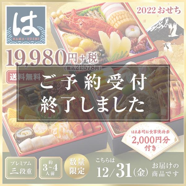 ・はま寿司おせち プレミアム三段重(税込21,578円・はま寿司お食事優待券2,000円分付)